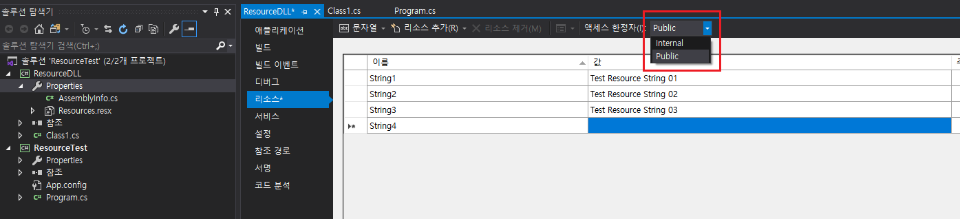 엑세스 한정자를 Internal 에서 Public 으로 설정 후, 적절히 리소스를 추가한다.